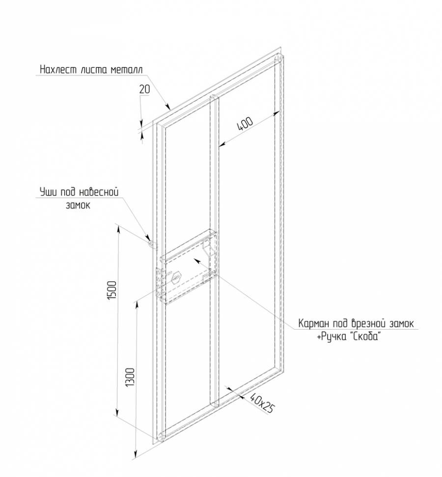 - Лист металла размечается согласно определенным габаритам створок. Левая створка должна быть шире на 10-20 мм, чтобы накладываться внахлест.