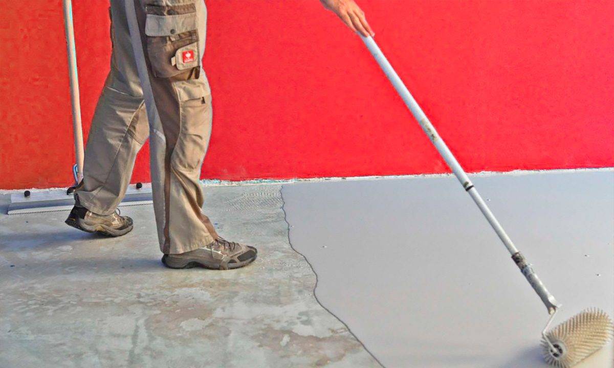 Сначала надо визуально оценить состояние основания. Необходимо убедиться в отсутствии трещин, бугров, выбоин, участков, на которых есть крошащийся бетон. Все дефекты следует заделать, воспользовавшись самовыравнивающейся смесью. Затем поверхность грунтуется.