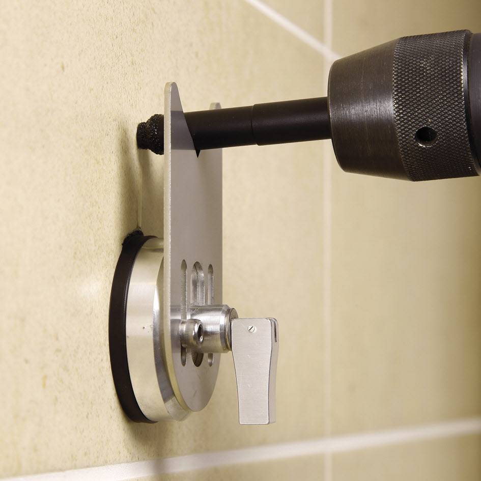 Балеринка удобна в случае, когда необходимо сделать много отверстий различного диаметра. Перед работой круговой насадкой просверлите отверстие победитом или стальным пером. Так балеринка не сместится и не испортит лицевую часть декоративной плитки.