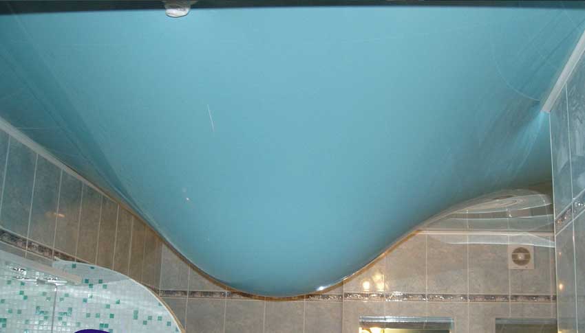 Одной из причин провисания натяжного потолка может быть затопление водой. Потолки, выполненные из ПВХ-пленок, при этом скапливают на себе поступающую воду и выгибаются внутрь помещения, образуя огромный водяной пузырь. То, что потолок прогнулся под весом воды, но при этом все крепления остались на своих местах, свидетельствует о хорошем качестве монтажа.