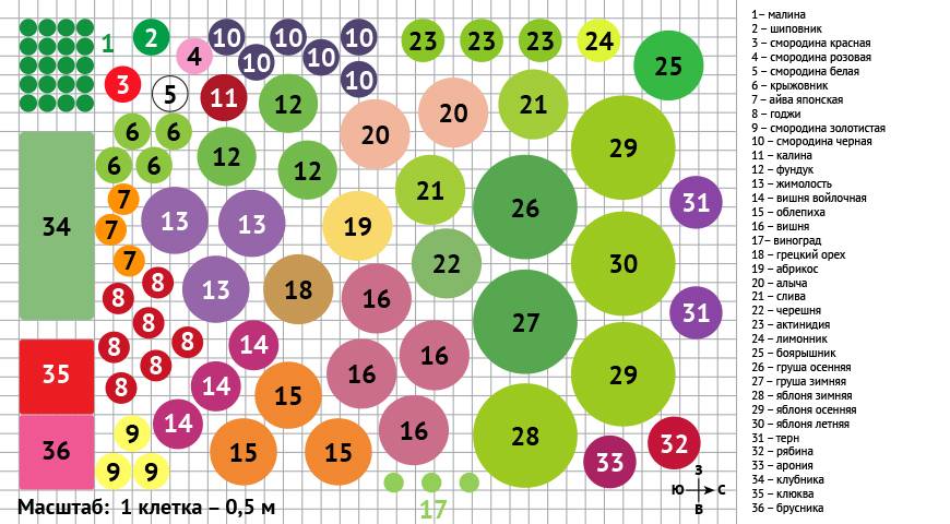 На плане они все расположены с учетом высоты: на северной стороне самые высокие, на южной самые низкие. Именно так они не будут затенять друг друга. Исключения мы сделали только для 3 культур: рябины, аронии (черноплодной рябины) и боярышника. Они размещены не совсем по правилам – в тени. И урожайность у них, естественно, будет ниже. Но на это «нарушение» мы пошли сознательно, поскольку таких ягод много и не надо. Ну, согласитесь, вряд ли кому-то потребуется 10 ведер боярышника. Терн сидит за яблонями умышленно – это единственная плодовая культура, которая может расти в тени.