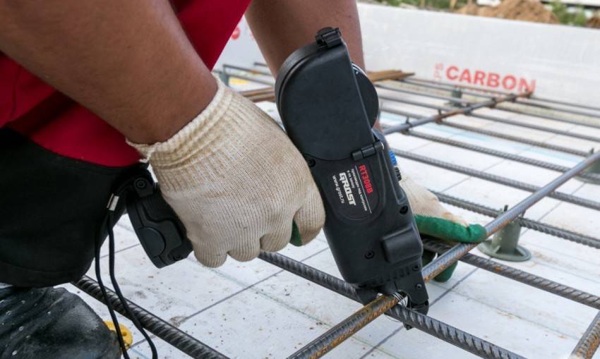 Далее, в местах стыковки стержней связываем их между собой, используя для этого отожженную вязальную проволоку и специальный крючок, а при его отсутствии пассатижи или клещи. Два или более арматурных прутка стягиваются между собой как показано на следующем фото устройства плитного фундамента ушп: