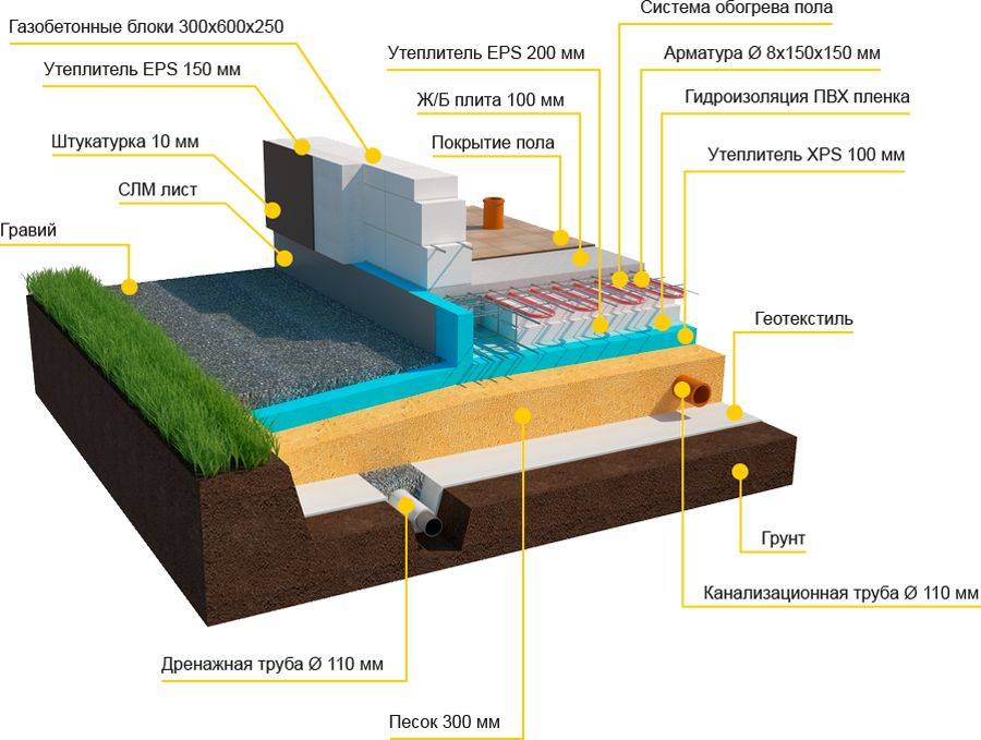 Обязательно наличие хорошей гидроизоляции со всех сторон. Утепление может быть как подфундаментное, так и располагаться в стяжке пола, и чаще всего для этих целей применяется экструдированный пенополистирол.