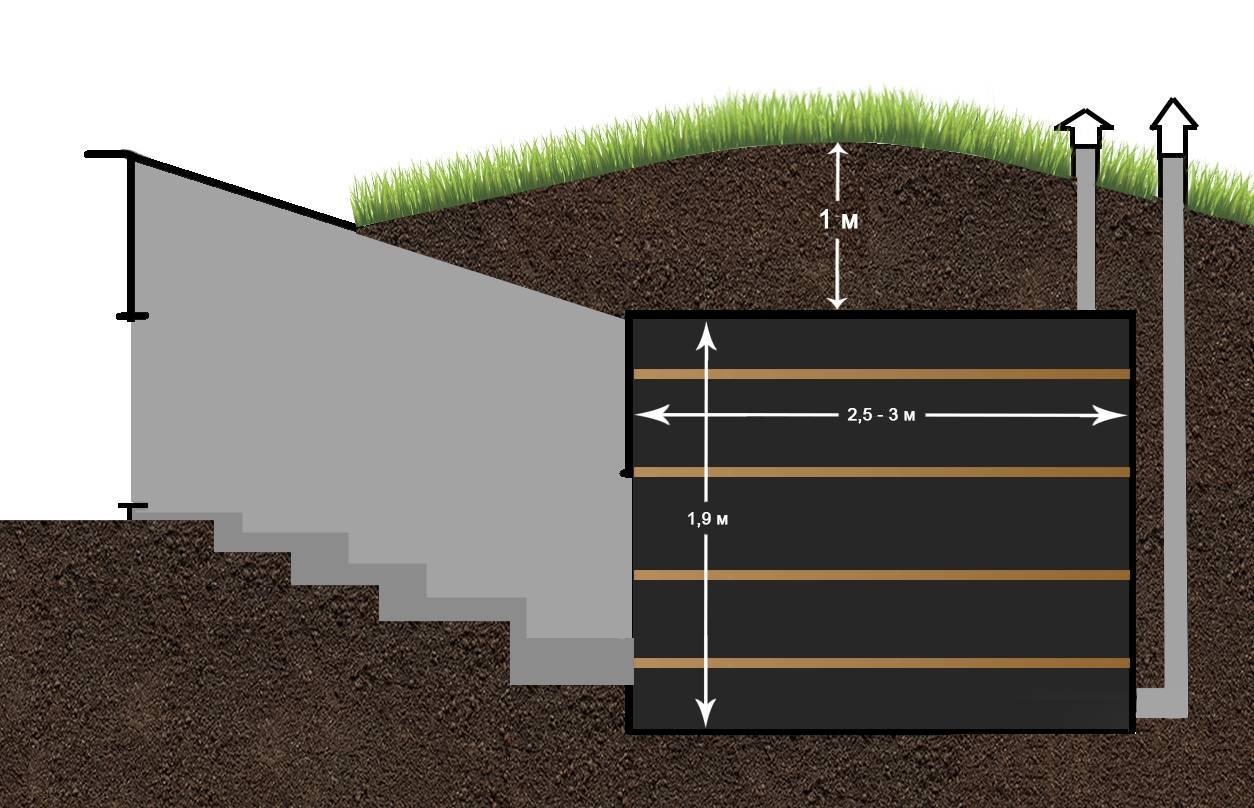 С целью вентиляции устанавливается вертикальная труба, а для отведения влаги вокруг выкапываются канавки. Такое хранилище считается временным, и как раз его можно увидеть в гаражах с естественной вентиляцией.