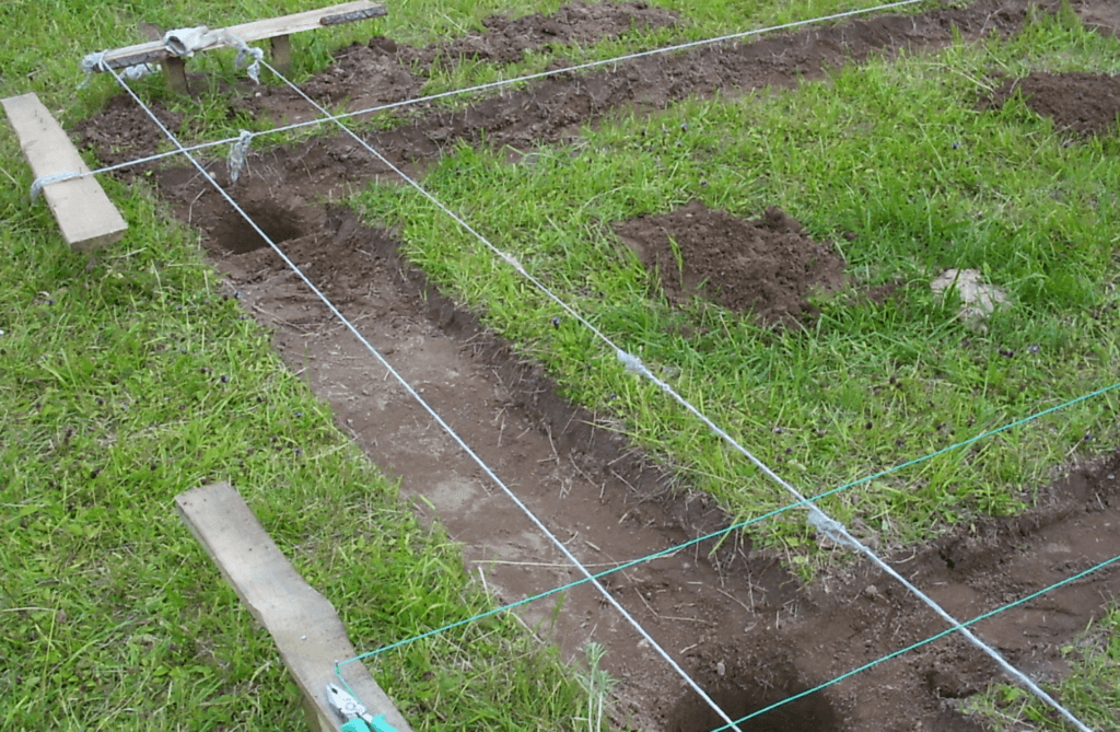 Первым делом, стоит разметить колышками внешнюю сторону, где мы будем копать траншею. Для замера длинны и определения углов, используем нитки и рулетку. Каждый строит свою беседку, поэтому о точных размерах рассказывать нет смысла.