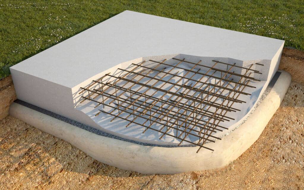 Применяется в случаях плывуна, близкого залегания вод, проседающего грунта. Преимущества: основательность, надёжность; в нашем случае тонкий монолитный фундамент может быть намного удобней ленточного, так как сразу создаётся площадка — пол беседки. Недостатки: требует больших трудозатрат и большего количества материалов, чем остальные виды, соответственно, дороже стоит.