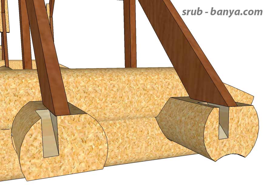 Выемка для кобылки. На конце матицы, рядом со стропильной ногой, при помощи пилы, стамески и молотка (киянки) делаем выемку, куда ляжет кобылка. |
