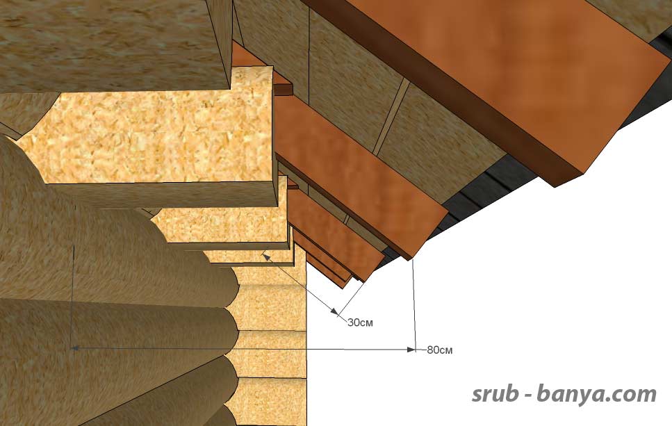 Свес крыши. Следующий этап монтажа стропильной системы – монтаж кобылок. Кобылка – отрезок доски, удлиняющий стропильную ногу для организации свеса крыши. Кобылки изготавливаем из доски сечением 5см на 10см. Длина кобылки – 1 метр. Выпуск кобылки за стропильную ногу в нашей конструкции составляет 30см, что позволяет организовать свес крыши (расстояние от конца кобылки до стены) 80 см. Рекомендую это расстояние делать не менее 75см. Это позволит надёжно защитить стены от атмосферных осадков и, при необходимости, разместить под навесом штабель дров для печки. Если стропильная система другой конструкции, то значение выпуска кобылки будет другим. Наша задача – сделать такой выпуск, который организует требуемый свес крыши. Для деревянного строения свес крыши должен составлять не менее 60см, для кирпичного – не менее 45см. |