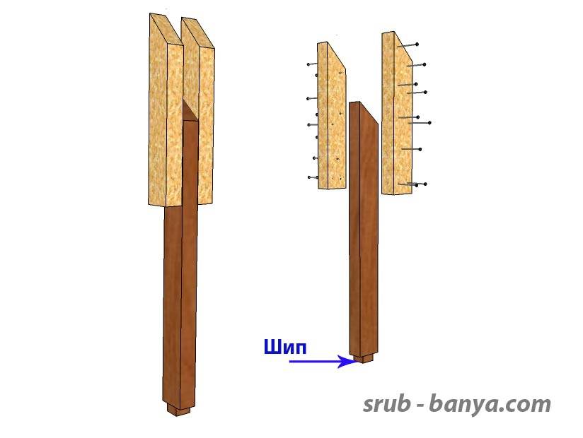 Сборка стойки. Прибиваем к стойке заранее заготовленные накладки. Для сборки применяем гвозди 100мм – «сотки». |