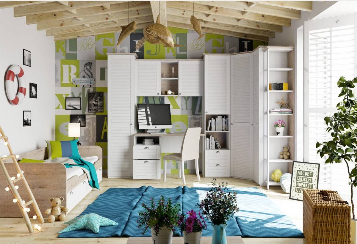 В первую очередь постарайтесь оптимально использовать пространство комнаты. В детской должна уместиться вся необходимая мебель, но при этом должно остаться много места для игр. Очень полезно разграничивать комнату на зоны – для игр, сна и учебы. В каждой зоне должна стоять определенная мебель. При этом можно даже выделить эти зоны цветом. Например, стены в зоне сна покрасить в спокойный голубой оттенок, в зоне учебы – в нейтральный зеленый, а в зоне игр – в более яркие, веселые оттенки.