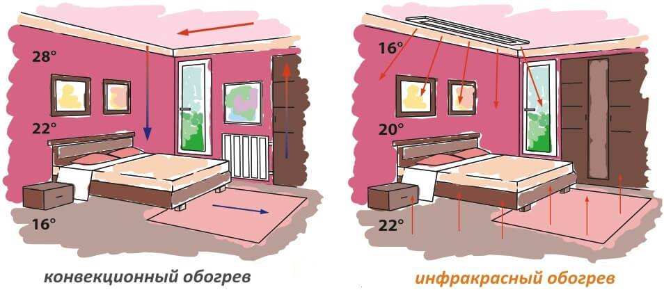 Установка инфракрасных обогревателей более разумное решение и, скорее всего, наиболее выгодное. Дело в том, что данные изделия нагревают не воздух в помещении, а определенные объекты (пол, стены, шкаф), от которых в дальнейшем и происходит передача тепла. Если в предыдущем варианте горячий воздух будет подниматься к потолку и сразу же остывать, то в данном случае тепло направлено к полу, что более разумно (люди по потолку не ходят).