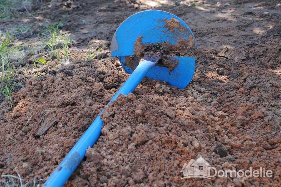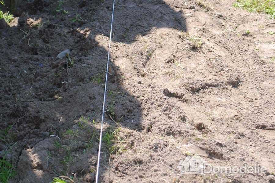 Процесс проходил по натянутому шпагату. Участок под будущий забор оказался практически без уклона, только в центе был небольшой наплыв, который был срезан лопатой. С помощью садового бура бурились лунки глубиной 1 метр.