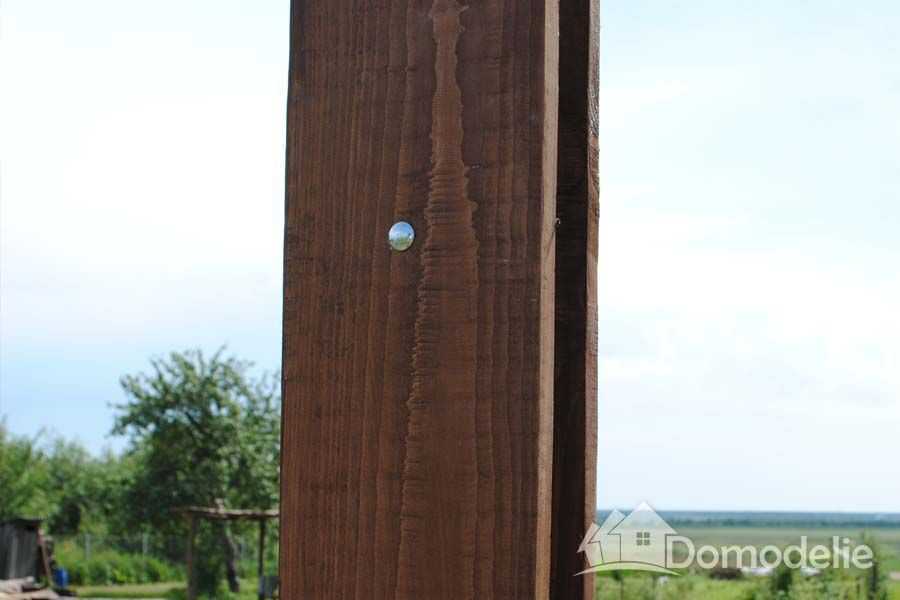 Между лицевыми и тыльными досками был также вставлен подготовленный брусок 2.5х5, который помимо декоративной функции, значительно усилил конструкцию забора из необрезной доски.