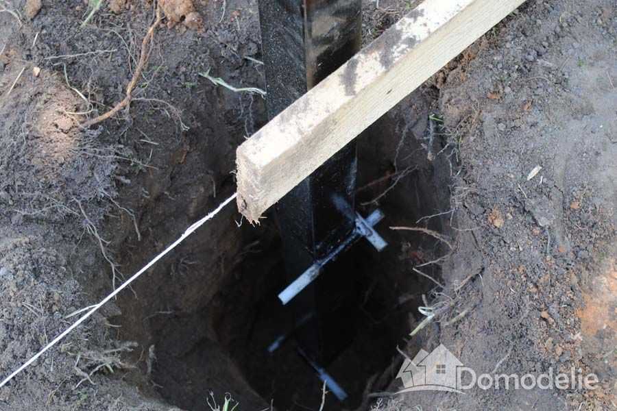 В первую был установлен, соответственно, первый заборный столб. Его положение регулировалось двумя уровнями и деревянным шаблоном, который определял высоту столба над землей.