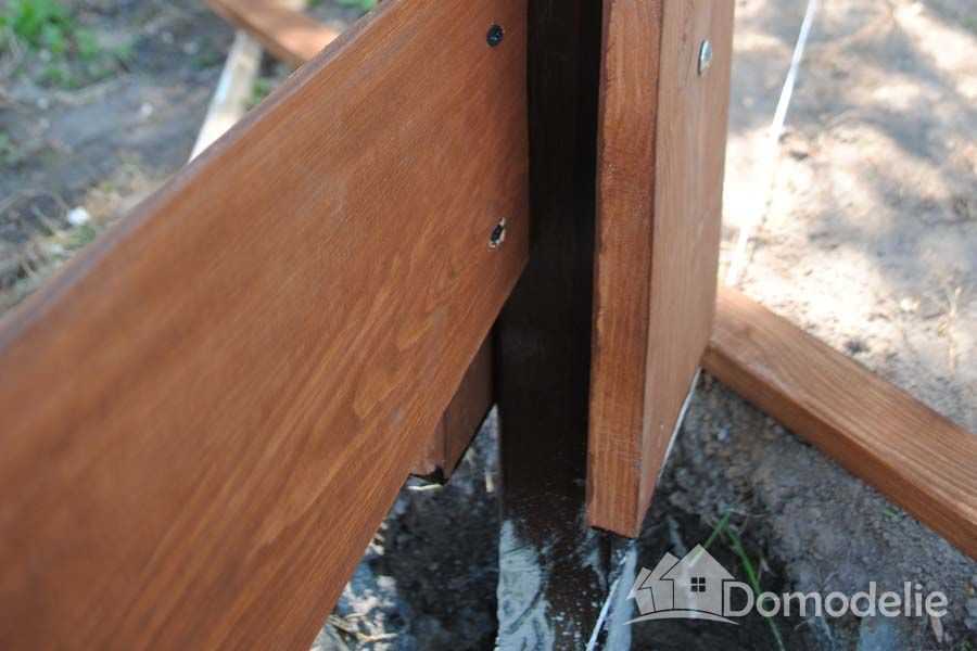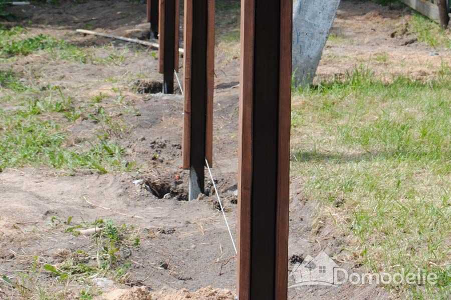 - Когда ямы подготовлены, в них нужно опустить опоры. Они могут быть изготовлены из дерева, металла или бетона. Как показывает практика, лучше всего использовать деревянные или металлические столбы, поскольку их стоимость намного дешевле остальных материалов, а процесс при устройстве значительно проще. В качестве металлических столбов прекрасно подойдет профилированная труба, а если принято решение установить деревянные опоры, то перед погружением в землю рекомендуется нижнюю часть обработать специальными препаратами, которые предотвратят гниение дерева.
