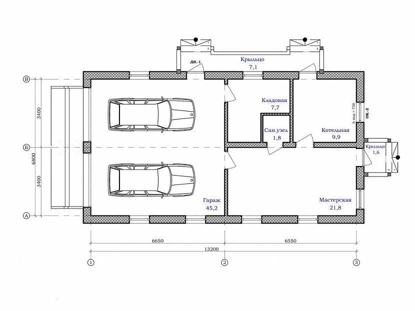 Простейший гараж на два автомобиля. Имеет два отдельных помещения под каждый автомобиль, между которыми расположена перегородка.