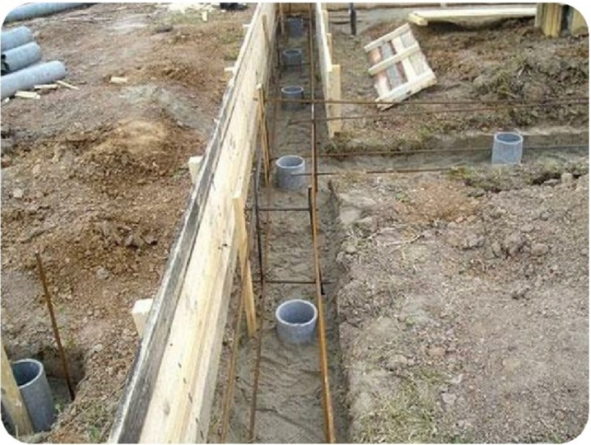 Ленточный фундамент устраивается подобным образом, но без свайных конструкций. Достаточно вырыть канаву по периметру здания и под несущими конструктивами на глубину до полуметра. Далее отсыпается дренажный слой, устанавливается опалубка и гидроизоляция. Арматуру вяжут в соответствии с чертежами из проекта. Теперь приготавливают бетон не ниже класса В15 (М200) и заливают в опалубку, которая может быть съемной и несъемной