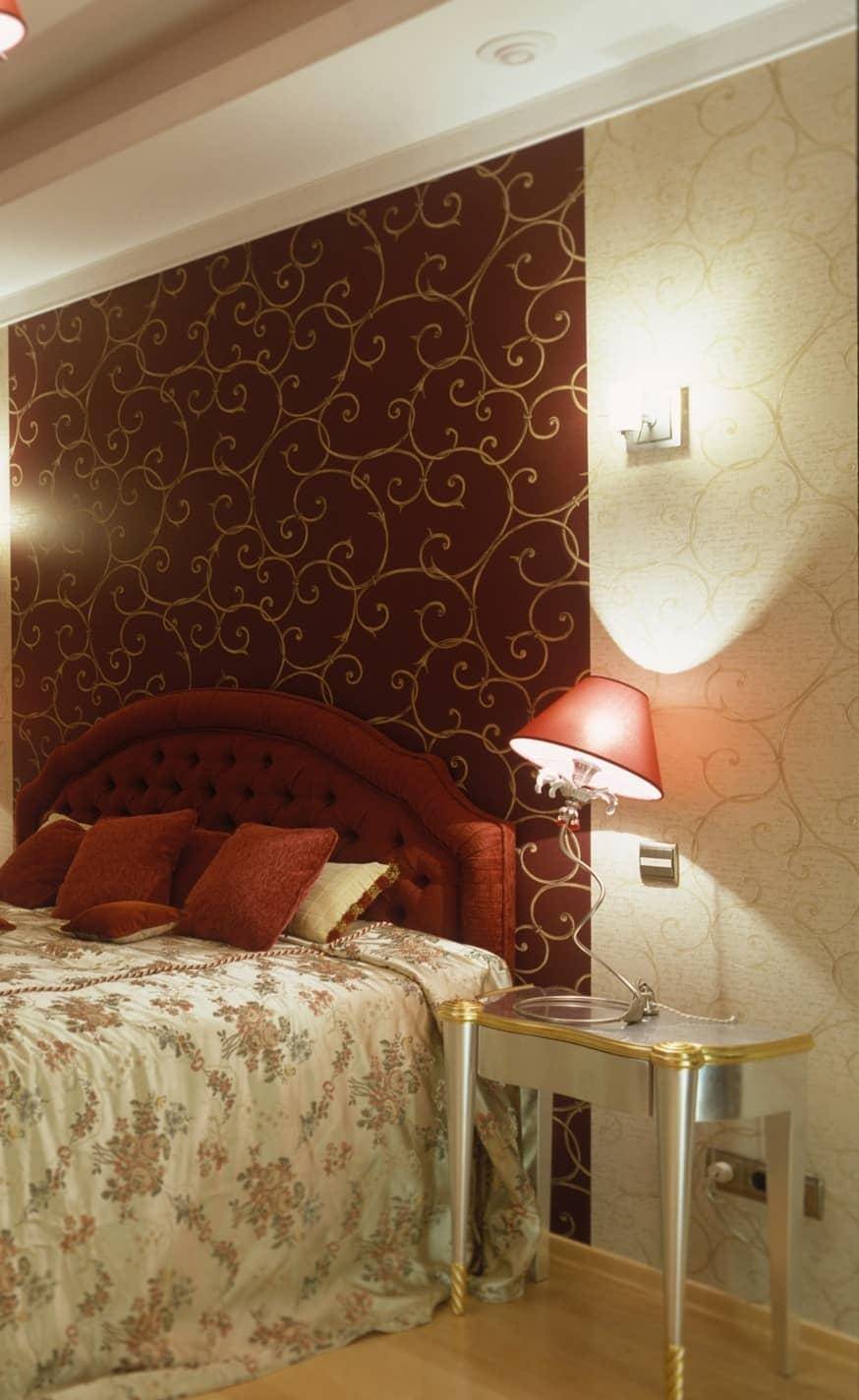 С помощью панно из обоев в спальне можно обозначить спальную зону, главное — выбрать правильное сочетание цветов