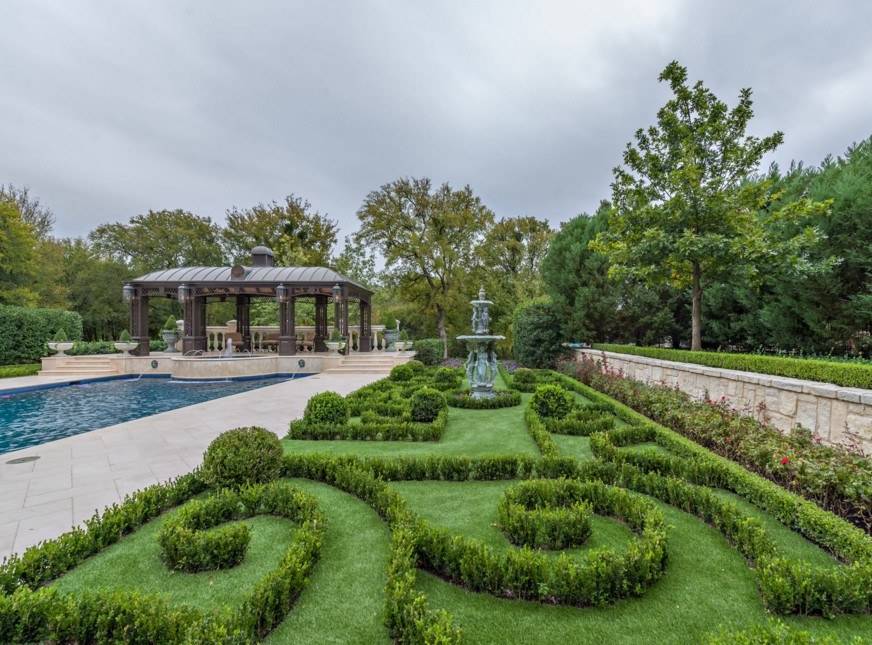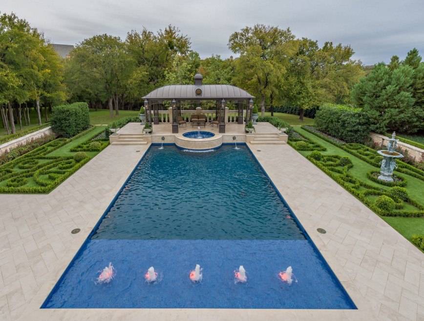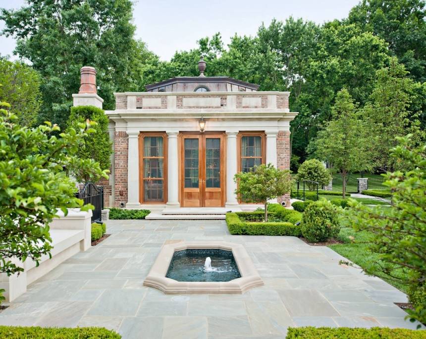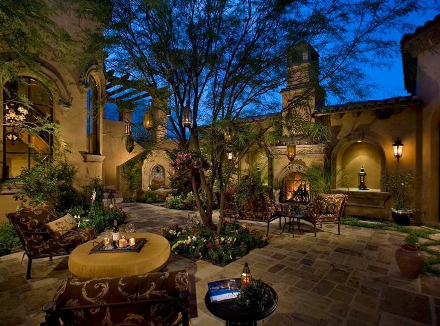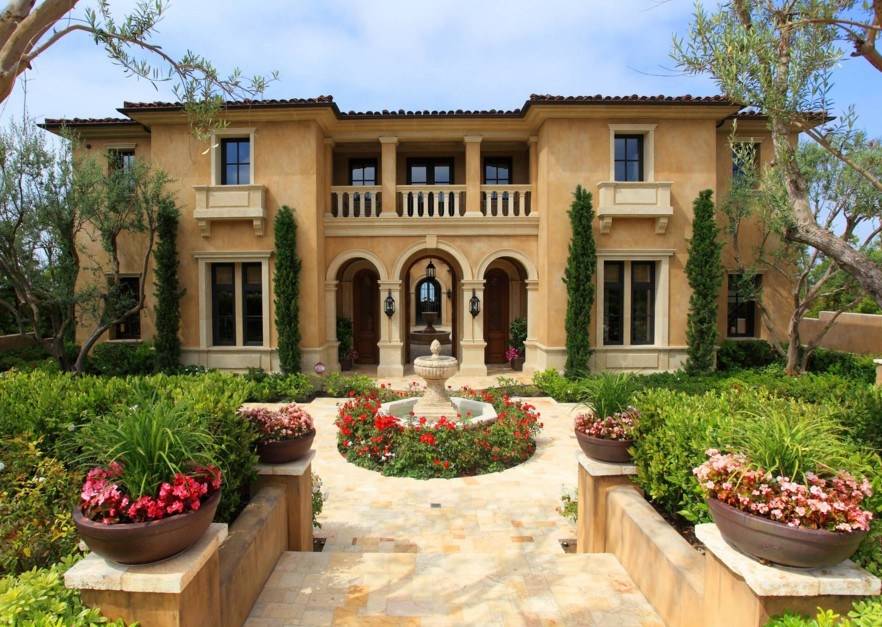 Что касается архитектурных элементов, то и их здесь хватает. Во внутренней части обустраивают дворик патио, территорию украшают арками, террасами и живыми изгородями, и, конечно же, фонтанами.