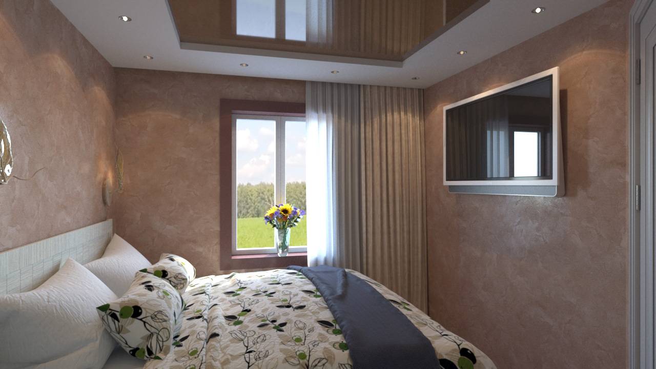 Спальня хозяев дома — место спокойного отдыха. Удивительно, но в этой комнате прекрасно размещается и двуспальная кровать для отдыха, и плазменный телевизор на стене, и зеркальный навесной потолок. И даже есть отличный вид на природу из окна. Одним словом, уединенное местечко для двух любящих сердец.