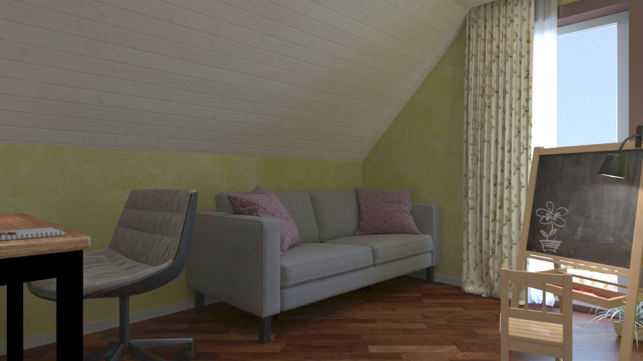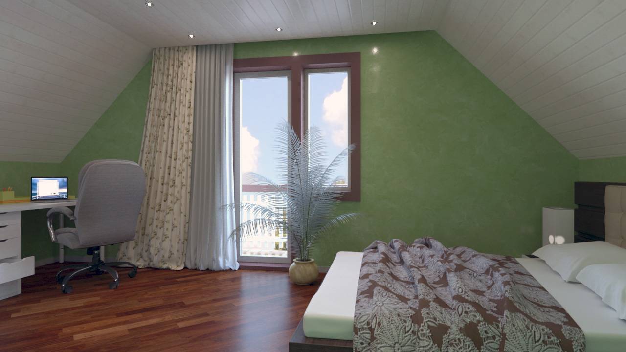 Большая спальня. Здесь также хватит места для занятий, игр и спокойного сна. Дизайнер разместил здесь двухспальную кровать — например для взрослого сына с женой, или дочери с мужем. Но тут может отлично разместиться и две кровати для школьников одного пола. Балкон также доступен для обзора местных достопримечательностей и поступления свежего воздуха в комнату. При желании тут можно создать очень артистический и необычный интерьер для творчества детей.