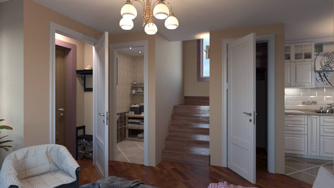 Вид со стороны окна. Этот ракурс прекрасно демонстрирует возможности первого этажа. В тамбуре можно раздеться и разуться. Сразу у входа доступен туалет, лестница на второй этаж, кладовка и кухня, откуда доносятся вкусные запахи.