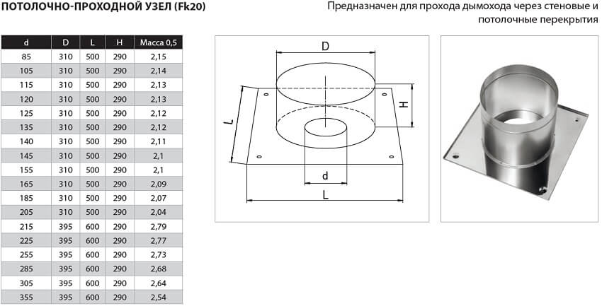 Для проходного узла в потолочном перекрытии подбирают изделие, состоящая из пластины-нержавейки и горловины, диаметр которой чуть больше печной трубы.