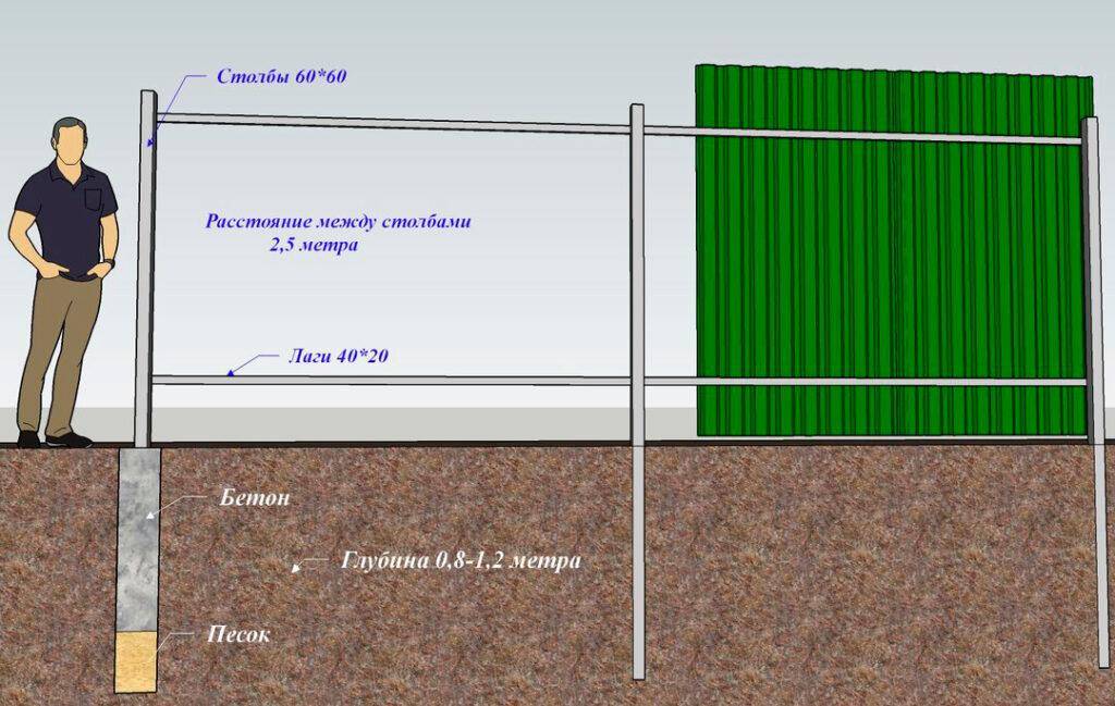 Первый этап монтажа – установка опор. Их следует закрепить на уровне 0,8-1 м под землей. Расстояние между опорами делается одинаковым и зависит от длины пролетов забора. При установке секций они крепятся к столбам с помощью саморезов.