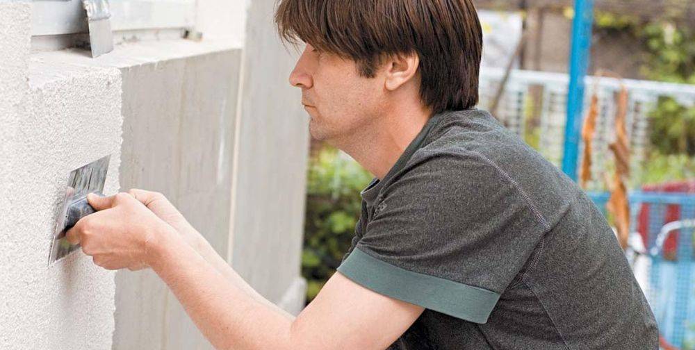 Оштукатуривание фасада начинают от угла здания. Работу выполняют поэтапно, постепенно нанося смесь на участки небольшой площади. Первый слой – базовый. Его наносят шпателем так, чтобы избежать нахлестов и получить как можно более ровную поверхность. Для выравнивания можно использовать шпатель с широким лезвием или правило.