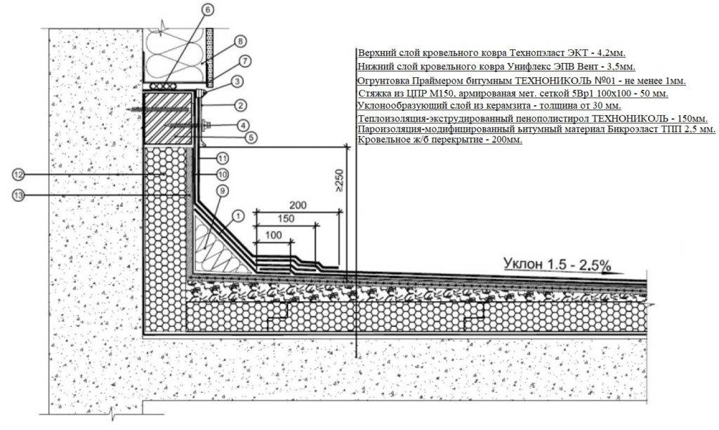 - Шестое — приклеивание первого дополнительного слоя с заведением на стену на высоту не менее 150 мм, на ширину 250 мм по горизонтали, на карнизе и коньке.