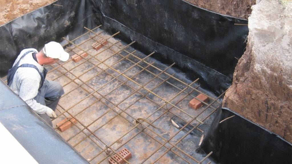 На днище погреба настилаются два слоя полотнищ рубероида с перехлестом не менее 10 см и заделкой стыков битумной мастикой. Полотнища рубероида должны лежать на днище средней частью рулона так, чтобы их можно было бы впоследствии загнуть на стены погреба. Очевидно, что оба слоя полотнищ рубероида располагаются во взаимно-перпендикулярных направлениях.