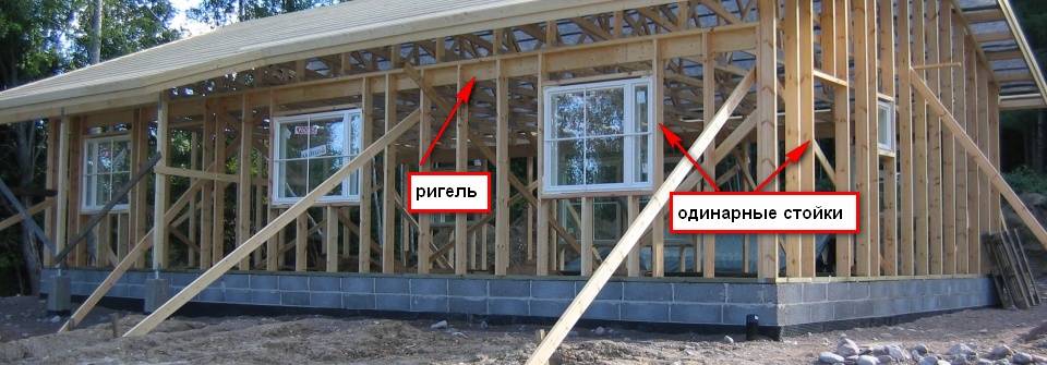 Вместо сдвоенных стоек появляется новый элемент — ригель (на фото выше). Ригель — это доска (стоящая на ребре), врезанная в самой верхней части стоек каркаса (перед нижней обвязкой) снаружи или внутри. Я буду врезать снаружи, ведь это удобнее, но правильнее врезать ригель внутри (но тогда неудобно поднимать стену, хотя это и решается). Ригель распределяет нагрузку от балок перекрытия, а значит, нам не нужен хидер (ригель по сути уже и есть хидер, только во всю длину стены и одиночный).
