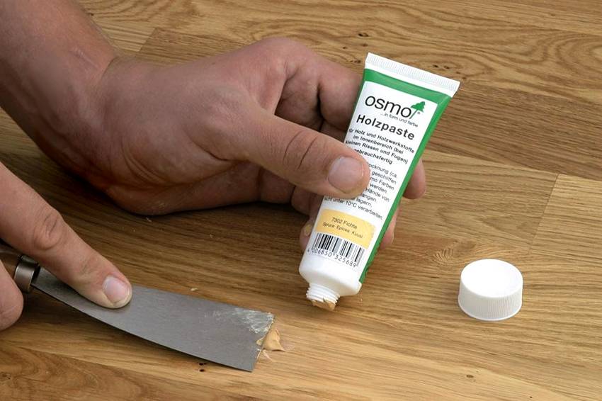 Полезная информация! Второе название шпаклевки для паркета – реставрационная паста. Если не удалось найти необходимый вариант на полках магазинов, пасту можно попробовать сделать самостоятельно.