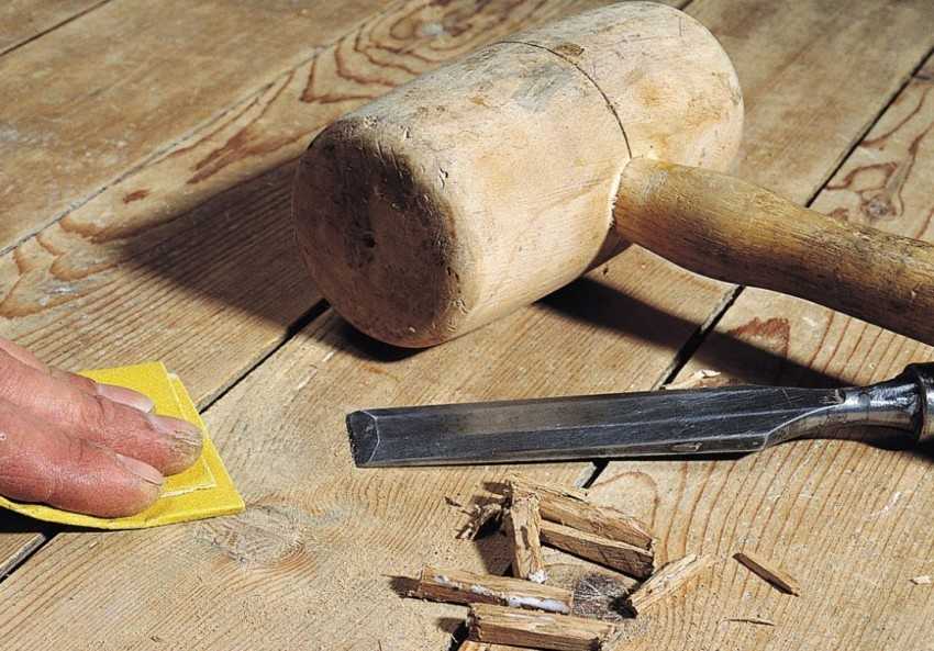 - При помощи стамески извлечь плашки, которые шатаются. Если элемент достается плохо, можно попробовать острым концом расколоть деталь, вставив стамеску параллельно структуре волокна. После раскола элемент достается по частям.