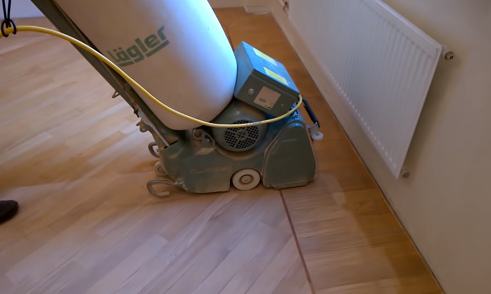 - Снимается слой старого лака. Для этого используются циклевочные или шлифовальные машины. А в углах и во всех труднодоступных местах пола подойдет угловая шлифовальная машинка. Можно удалить лак и специальным промышленным феном. Лак нагревается и затем легко снимается шпателем.