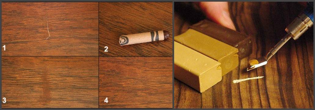 - Использование воскового карандаша. Такой способ очень экономичный, быстрый и простой. Но подходит он только для маленьких, неглубоких повреждений;