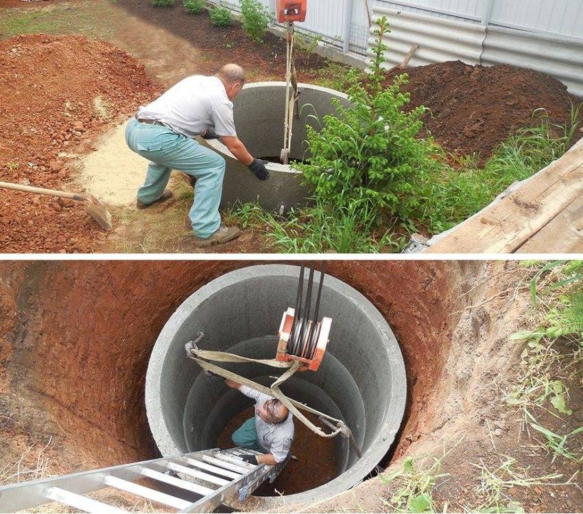 Кольца опускаются по одному. Места прохождения труб изолируются для предотвращения трещин после усадки бетона, стыки между кольцами заделываются цементом и обрабатываются силиконовой смазкой для герметизации.