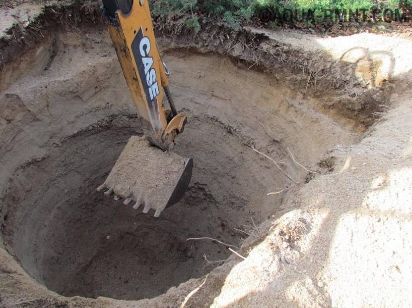 Расчеты будут такими же, как в случае со скважиной. Диаметр котлована должен на 50-80 см превышать размеры кольца, чтобы потом можно было делать наружную гидроизоляцию. Что касается глубины, то нужно учитывать высоту колец и фильтрующей подушки (около 30 см).