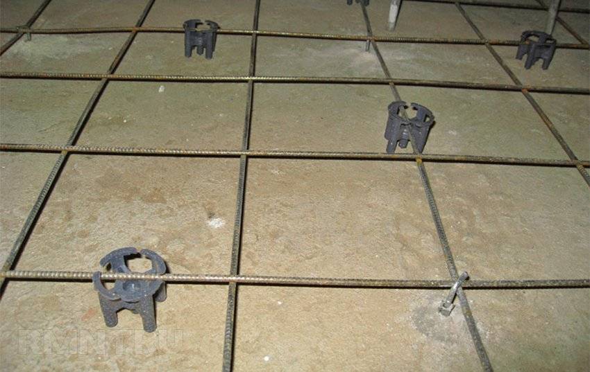 Для укрепления стяжки используйте нейлоновую или стальную сетку с ячейкой 30–60 мм и укреплёнными (сваренными) пересечениями. Синтетическая сетка натягивается на саморезах, вкрученных в подготовительный пол, либо на тонких спицах из вязальной проволоки, закреплеённых в подсыпке. Также возможна укладка сетки в только что залитую смесь. Стальные армирующие сетки за счёт собственной высокой жёсткости могут размещаться на дистанционных «стульчиках».