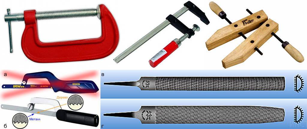 Купить электролобзик, конечно, неплохо будет; он не так уж дорог и пригоден для самых разнообразных работ. Но на первых порах вместо него можно пользоваться… рамочной ножовкой по металлу; в продажу такие идут еще как ножовки-мини. Только не надо брать целиком пластиковые (слева внизу на рис., поз. а). Это инструмент для редкого случайного использования. Такое чудо в интернете можно найти аж по 18 руб., но пластиковые губки быстро съедаются сталью полотна, и на хорошую табуретку «сверхдешевой» ножовки не хватит. Нужно брать мини-ножовку со стальной рамкой, поз. б. Она обойдется уже где-то в 50 руб., но ею можно работать долго и регулярно.