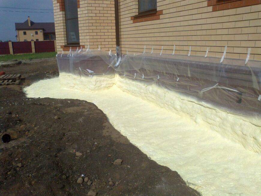 - При работе с пенополиуретаном достаточно освободить фундамент от земли. Выравнивать и грунтовать поверхность не требуется.