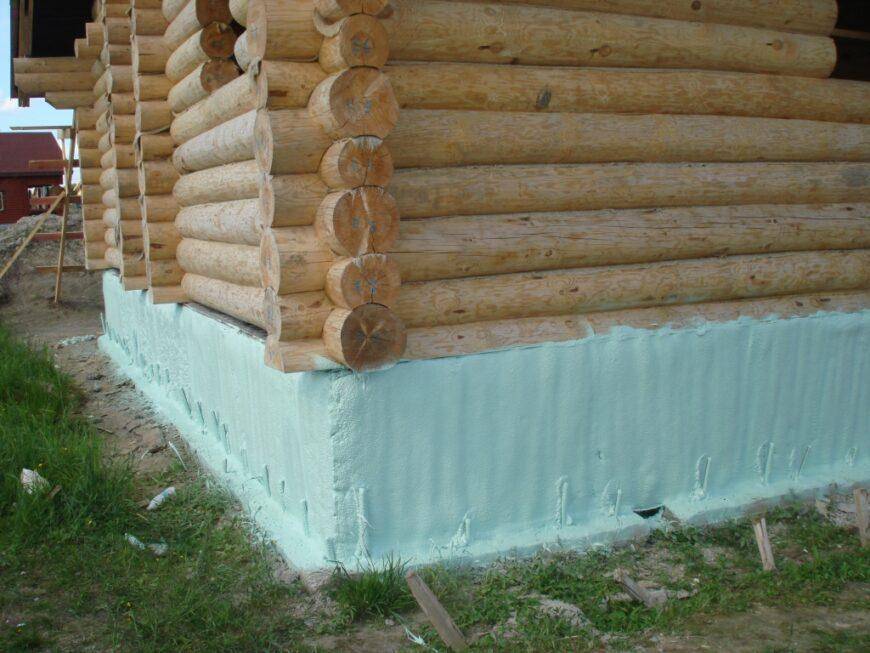 Напыление пенополиуретана производится на бетонную поверхность фундамента, открытого до уровня промерзания. Слой в 5 см. надёжно покрывает поверхность, заделывая все трещины и пустоты.
