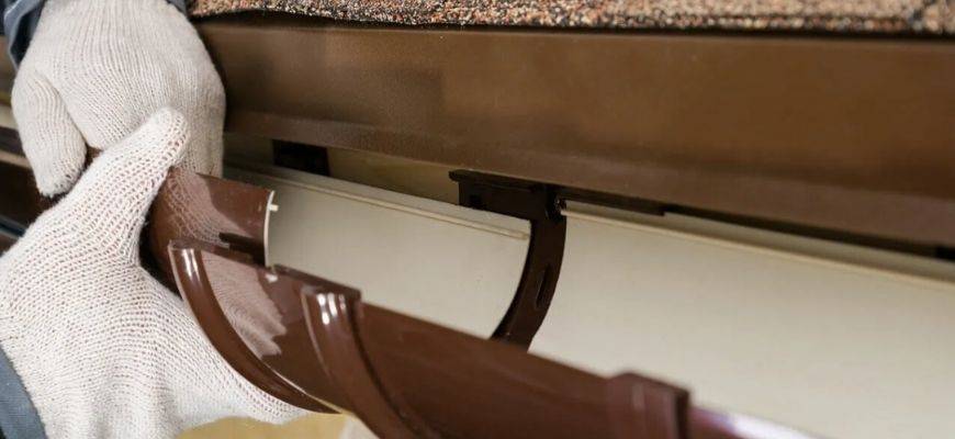 Основная функция водоотвода приходится на трубы и желоба. Для того чтобы прикрепить их к кровле или соединить между собой, применяются различные аксессуары. К ним относятся: кронштейны, заглушки, колена, воронки и прочее. Поэтому процедура монтажа водосточной системы из пластика заключается в креплении аксессуаров и основных элементов с четкой последовательностью.