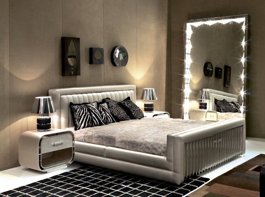 Грамотно подобранные отражающие поверхности формируют по-настоящему интересный и самобытный дизайн спальной комнаты