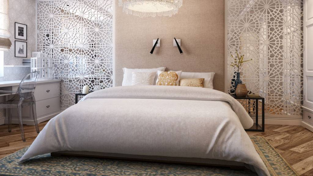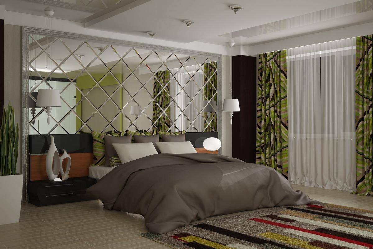 - если установить отображающее полотно над изголовьем, то можно визуально углубить пространство;