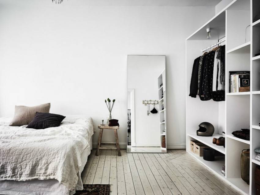 Большое зеркало, вмонтированное в дверцу шкафа, способствует зрительному расширению пространства