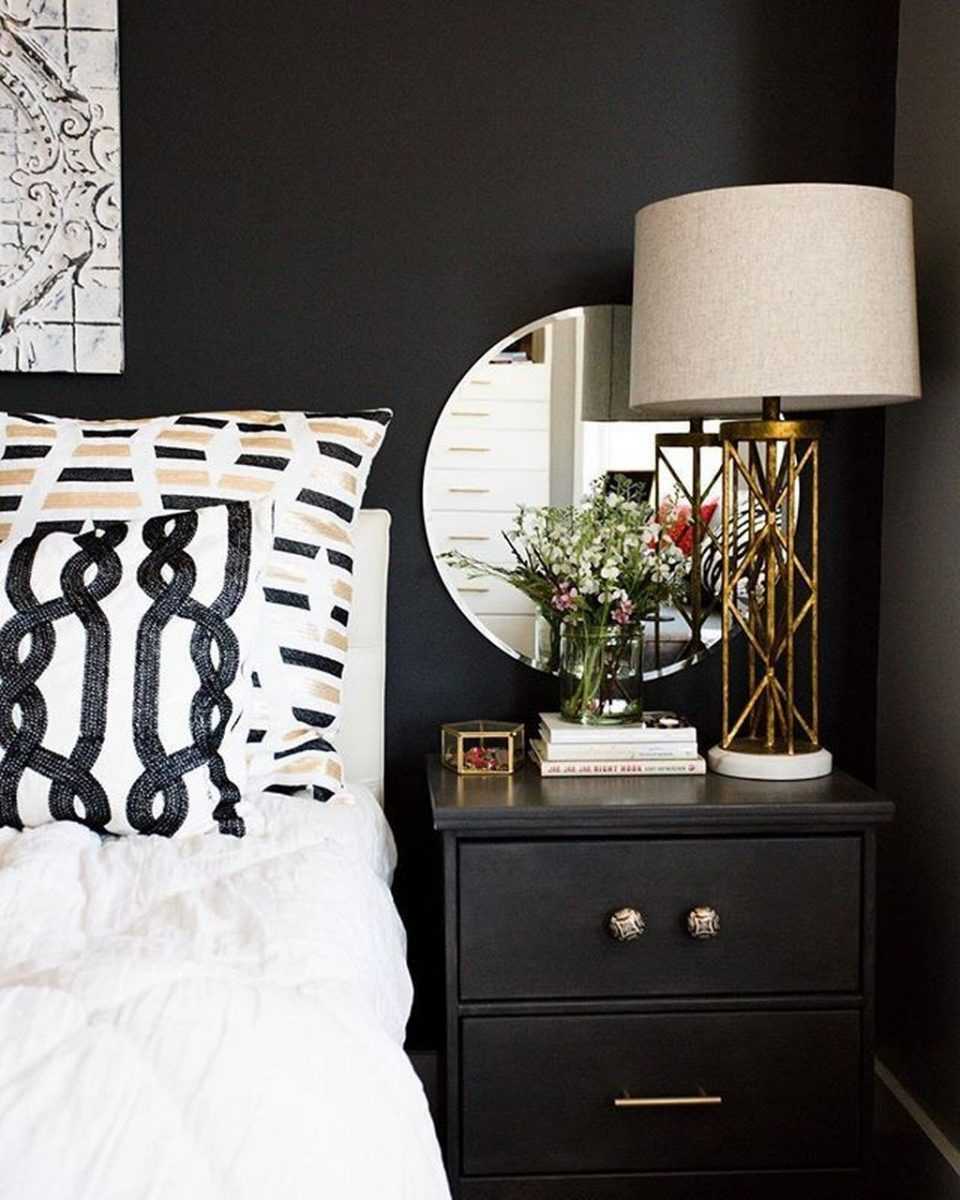 В маленькой спальной трюмо и зеркало для ухода за собой можно расположить в углу у окна. Это освобождает место возле изголовья кровати для комодов с торшерами и книгами.