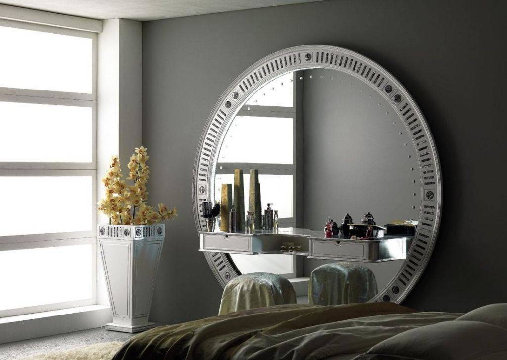 - В-третьих, размещение зеркала на туалетном столике в вашей спальне. Отличный вариант для тех, кто хочет совместить эстетичность туалетного столика и многофункциональность зеркала. При этом расположении необходимо учитывать, что для этого необходимо определенное свободное пространство, желательно с хорошим дневным светом.