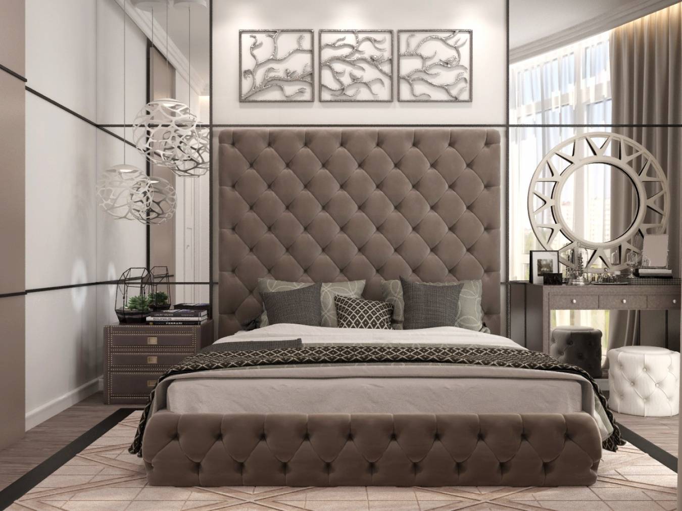 В форме солнца в этой спальне играет декоративную роль и подчеркивает принадлежность к стилю ар-деко. Цвет рамы перекликается с мебелью и текстилем, за счет этого монохромный интерьер стал интересным и многогранным.