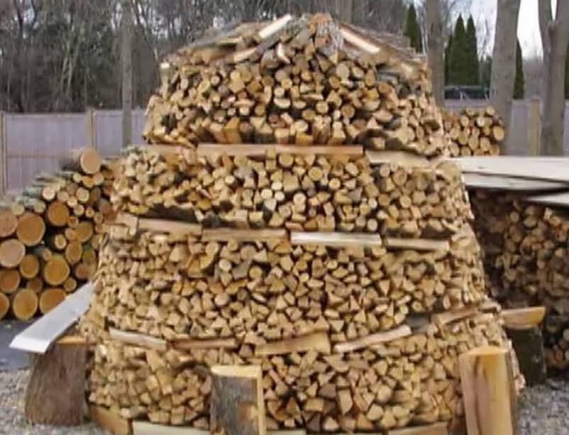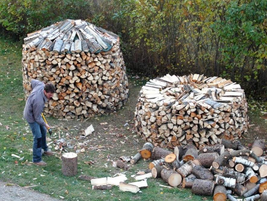 При круглогодичном проживании на даче требуется заготовка большого количества дров. Часто можно увидеть круглые дровницы высотой более четырех метров. Чтобы из такого хранилища брать дрова не нарушая формы домика, внутреннюю часть заполняют не вертикально установленными чурбаками, а горизонтально уложенными в виде лучей, идущих от центральной оси.